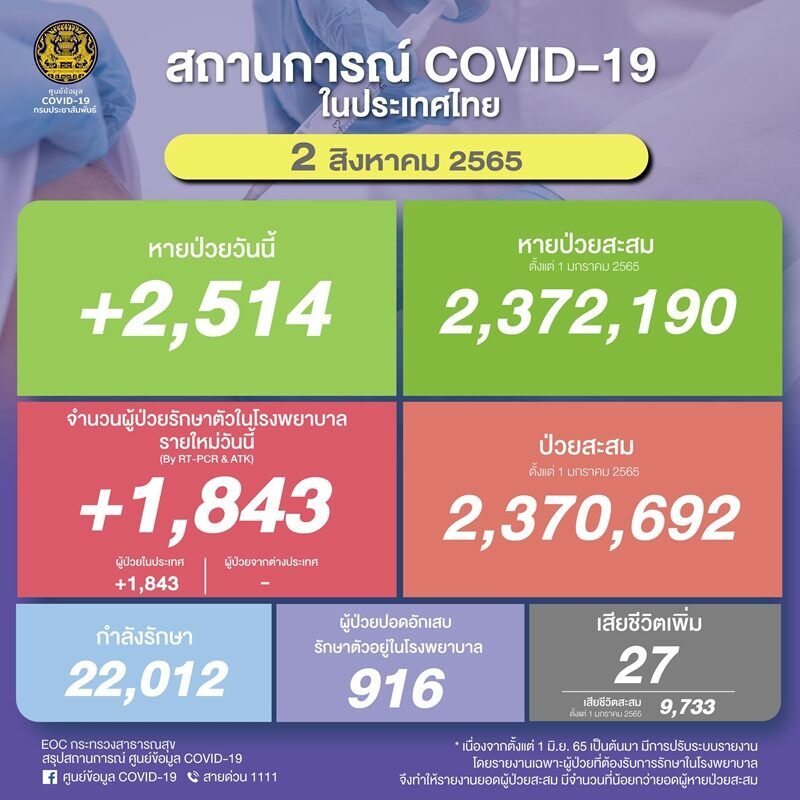 โควิดไทยวันนี้ ล่าสุด 2 ส.ค.65 ติดเชื้อเพิ่ม 1,843 ราย อัปเดตสถานการณ์แพร่ระบาดของโรคโควิด-19 ล่าสุด เสียชีวิตเพิ่ม 27 ราย หายป่วย 2,514 ราย