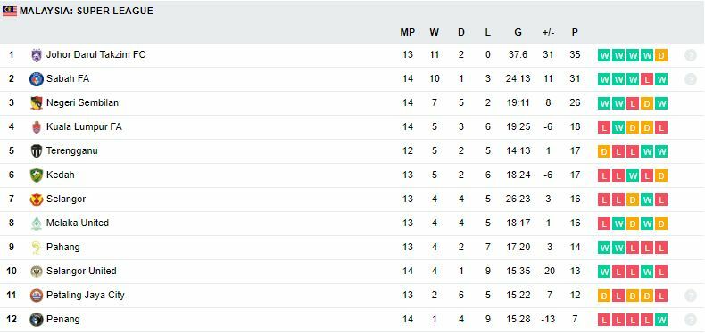 อัปเดตล่าสุด ตารางคะแนน มาเลเซีย ซูเปอร์ลีก 2022 ล่าสุด (2 สิงหาคม 2022)