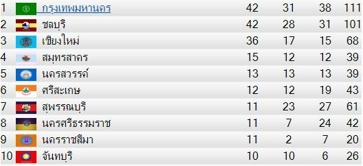 - กรุงเทพมหานคร 42 เหรียญทอง 31 เหรียญเงิน 38 เหรียญทองแดง (รวม 111 เหรียญ)