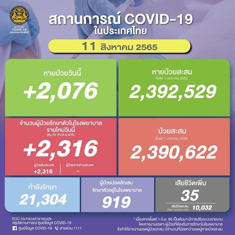 โควิดไทยวันนี้ 11 ส.ค. 65 ติดเชื้อเพิ่ม 2,316 ราย ดับ 35 ศพ