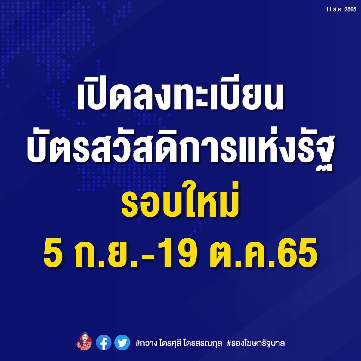 กวาง ไตรศุลี ไตรสรณกุล รองโฆษกรัฐบาล รายงานว่า กระทรวงการคลัง กำหนดระยะเวลาในการดำเนินโครงการลงทะเบียนเพื่อสวัสดิการแห่งรัฐ ปี 2565 โดยเริ่มเปิดรับลงทะเบียนตั้งแต่วันที่ 5 กันยายน – 19 ตุลาคม 2565 ตามช่องทางเว็บไซต์ของกระทรวงการคลัง และการลงทะเบียน ณ หน่วยงานรับลงทะเบียนในพื้นที่ทั่วประเทศ ได้แก่