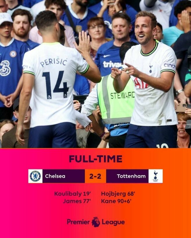 สรุปผลบอล พรีเมียร์ลีก อังกฤษ และ ตารางคะแนน ล่าสุด หลังกลับมาลงเตะกันเป็นสัปดาห์ที่สอง โดยเมื่อคืนวันอาทิตย์ที่ผ่านมา ในศึกลอนดอนดาร์บี้แมตซ์ เชลซี เปิดบ้านเสมอกับ สเปอร์ส ไป 2-2 โดยที่รูปเกมเป็นไปอย่างดุเดือด ก่อนจบท้ายด้วยการปะทะกันของยอดกุนซืออย่าง โธมัส ทูเคิ่ล และ อันโตนิโอ คอนเต้