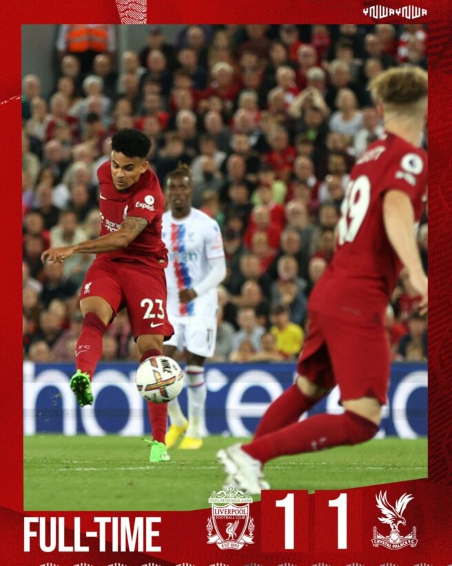 เวลาที่เหลือทั้งสองทีมไม่สามารถทำประตูเพิ่มได้ จบเกม ลิเวอร์พูล เสมอ คริสตัล พาเลซ 1-1 ทำให้ในตอนนี้ทัพหงส์แดงมี 2 คะแนนจากการเสมอ 2 นัด รั้งอยู่ในอันดับที่ 12 ของตารางในตอนนี้