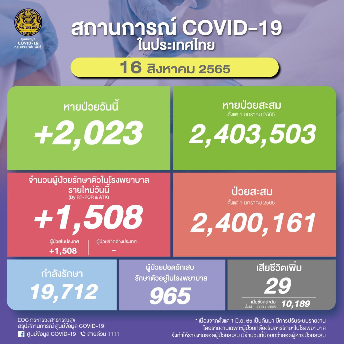 โควิดไทยวันนี้ 16 ส.ค. 65 ติดเชื้อเพิ่ม 1,508 ราย ดับ 29 ศพ