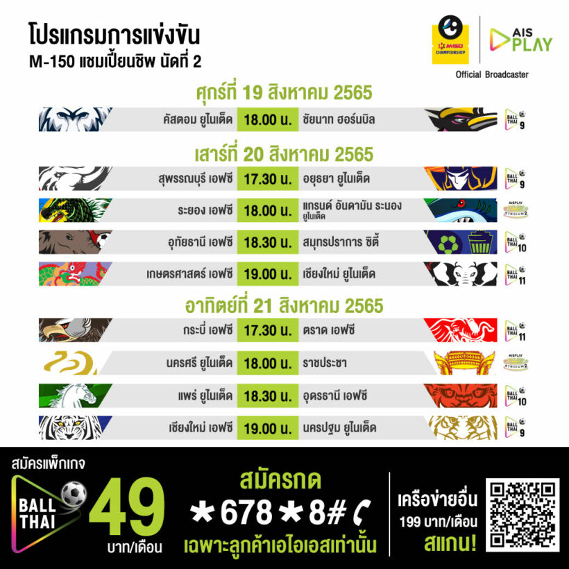 ตารางแข่งขัน ไทยลีก2 M-150 แชมเปี้ยนชิพ โปรแกรมฟุตบอลไทยลีก2 สัปดาห์ที่สอง ทุกคู่ถ่ายทอดสดทาง AIS Play