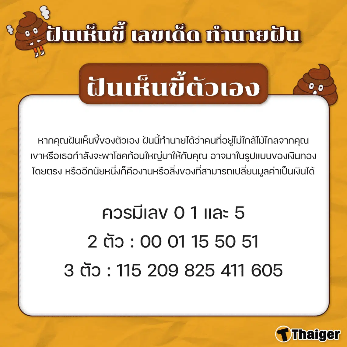 - เลขเด็ด ฝันเห็นขี้ตัวเอง : ควรมีเลข 0 1 และ 5