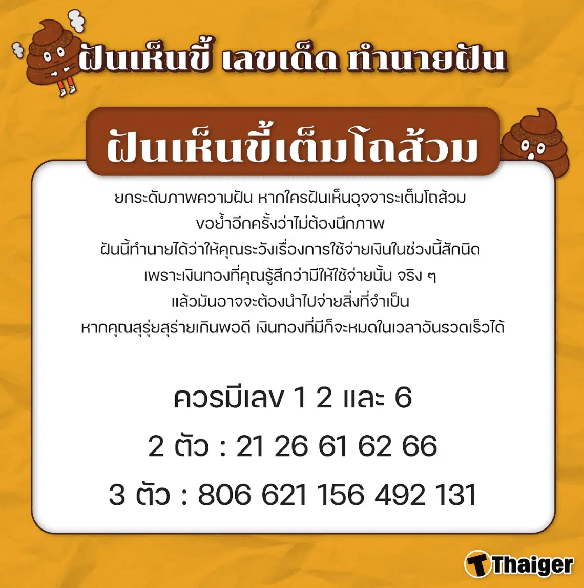 - เลขเด็ด ฝันเห็นขี้เต็มโถส้วม : ควรมีเลข 1 2 และ 6