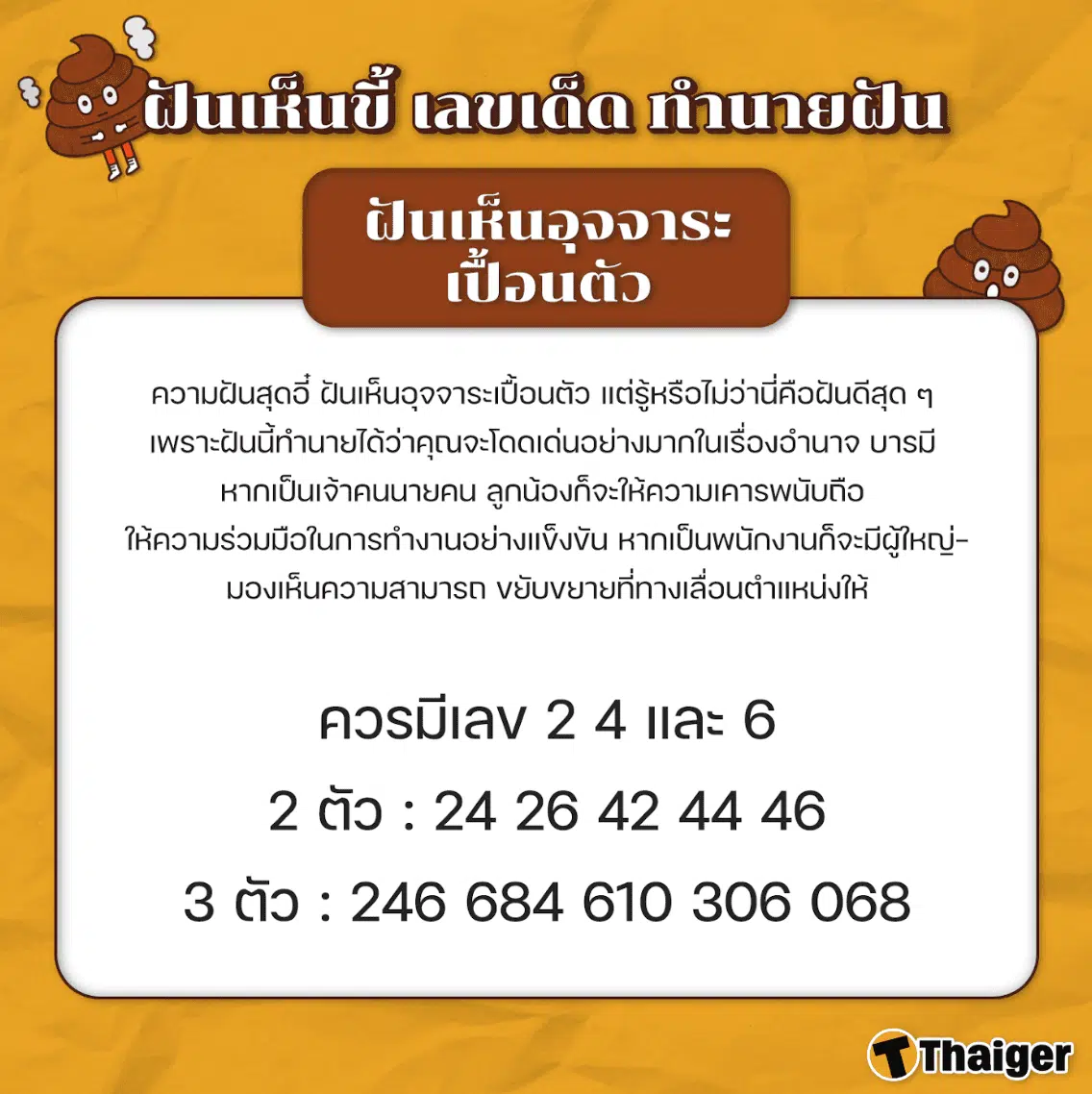 - เลขเด็ดฝันเห็นอุจจาระในโถส้วม : 2 4 และ 6