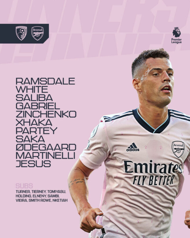ส่วนทางด้านทีมเยือน ในเกมนี้ มิเกล อาร์เตต้า ใช้ผู้เล่นเซตเดียวจาก 2 เกมแรก นำโดย เบน ไวท์, วิลเลียม ซาลิบา, โอเล็กซานเดอร์ ซินเชนโก้, กรานิต ชาก้า, มาร์ติน โอเดการ์ด, กาเบรียล มาร์ติเนลลี่ และ กาเบรียล เชซุส