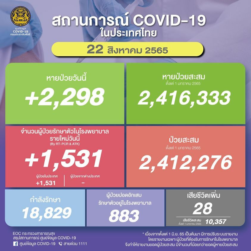 โควิดไทยวันนี้ ล่าสุด 22 ส.ค.65 ติดเชื้อเพิ่ม 1,531 ราย อัปเดตสถานการณ์แพร่ระบาดของโรคโควิด-19 ล่าสุด เสียชีวิตเพิ่ม 28 ราย หายป่วย 2,298 ราย