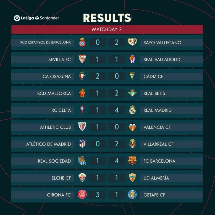 สรุปผลการแข่งขัน ลาลีกา สเปน หลังจบสัปดาห์ที่สอง