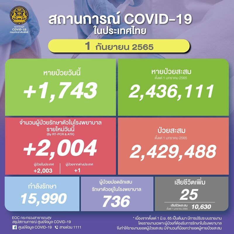 โควิดไทยวันนี้ 1 ก.ย. 65 ติดเชื้อเพิ่ม 2,004 ราย ดับ 25 ศพ