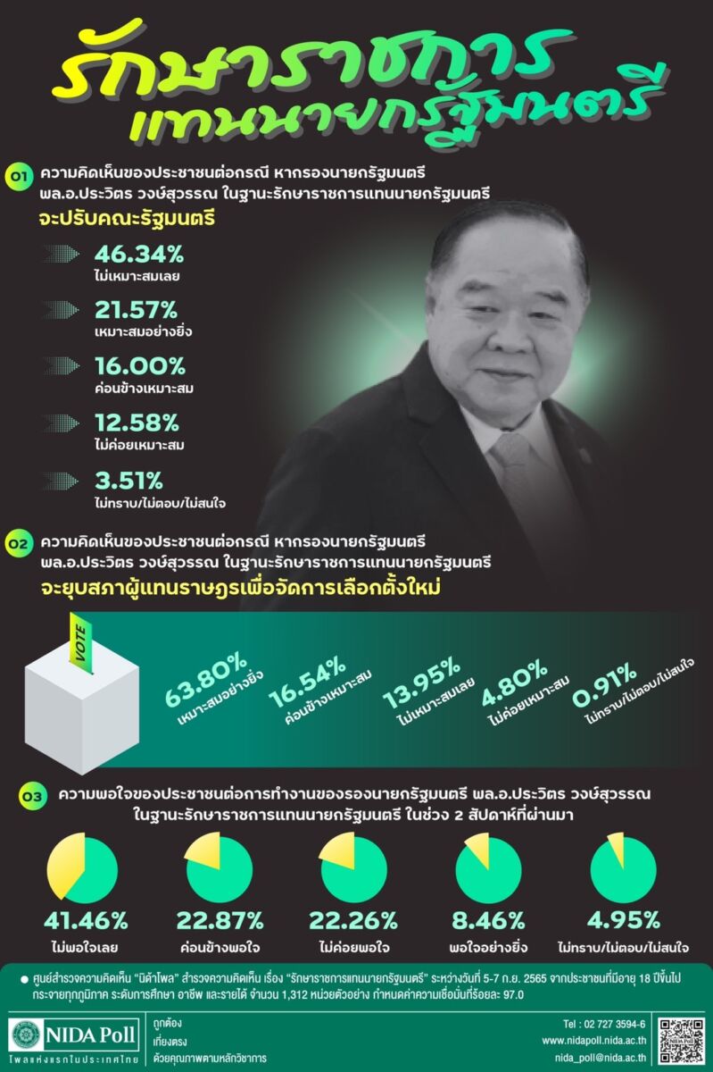 นิด้าโพล เผยผลสำรวจของประชาชนต่อ พล.อ. ประวิตร ถึงการปฏิบัติหน้าที่ พบ 41.46% ไม่พอใจ ประวิตร เชื่อเหมาะสมที่จะยุบสภา