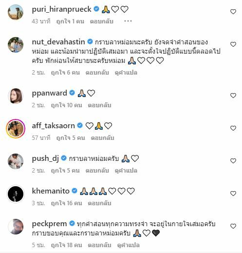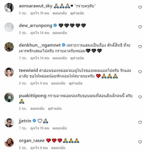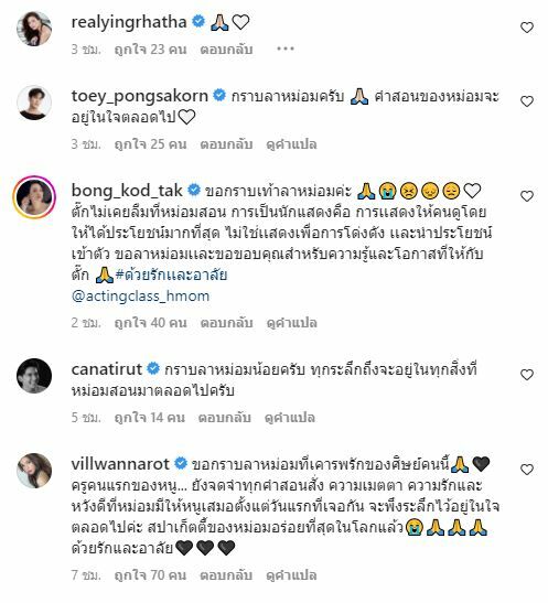 นอกจากนี้ยังมีทัพศิลปินดาราอีกเป็นจำนวนมาก ที่ได้เข้าไปโพสต์ข้อความไว้อาลัยหม่อมน้อยผ่านทางอินสตาแกรม @actingclass_hmom อาทิ แอฟ ทักษอร ภักดิ์สุขเจริญ, หญิง รฐา โพธิ์งาม, วิว วรรณรท สนธิไชย, แก้ม วิชญาณี เปียกลิ่น, ณัฏฐ์ เทพหัสดิน ณ อยุธยา และอื่น ๆ อีกมากมาย