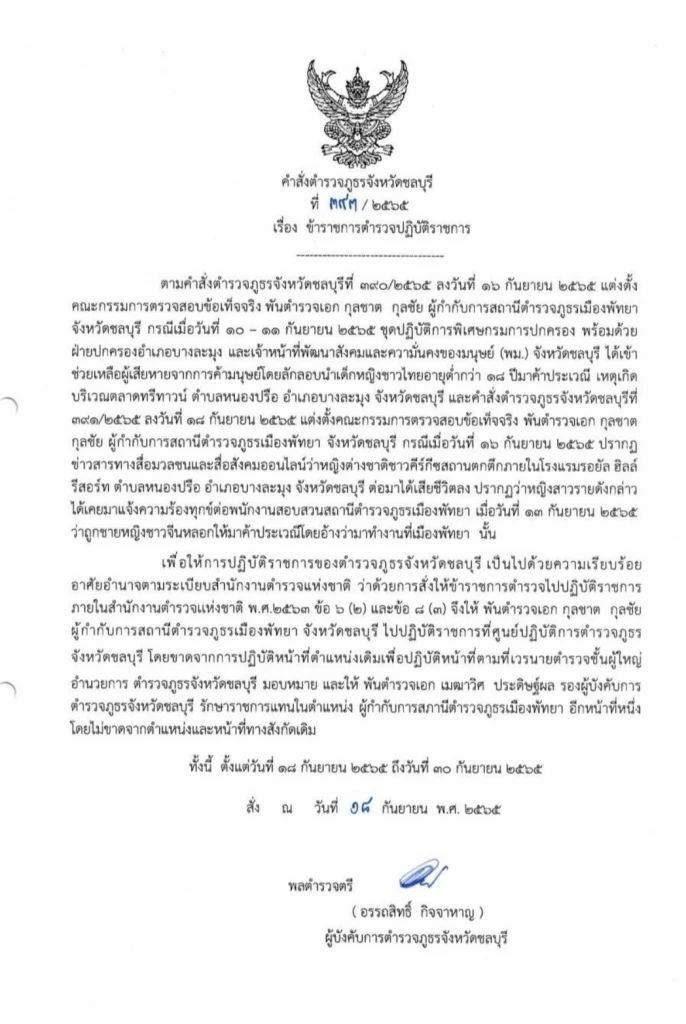 ตำรวจภูธรจังหวัดชลบุรีร่อนจดหมายมีคำสั่ง เด้งผู้กำกับพัทยา เซ่นปมหญิงคีร์กีซสถานกระโดดตึก หนีค้ากามจากกลุ่มชาวต่างชาติ