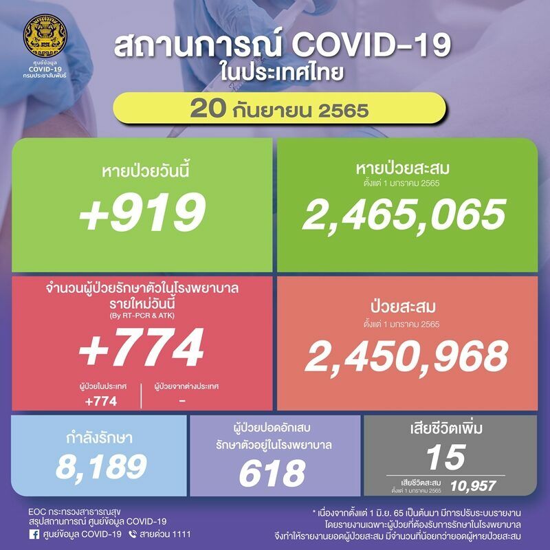 โควิดไทยวันนี้ ล่าสุด 20 ก.ย.65 ติดเชื้อเพิ่ม 774 ราย อัปเดตสถานการณ์แพร่ระบาดของโรคโควิด-19 ล่าสุด เสียชีวิตเพิ่ม 15 ราย หายป่วย 919 ราย