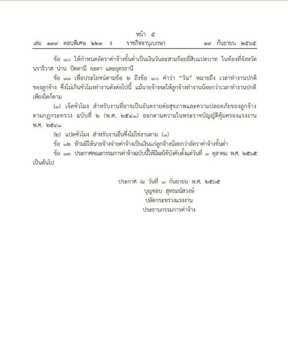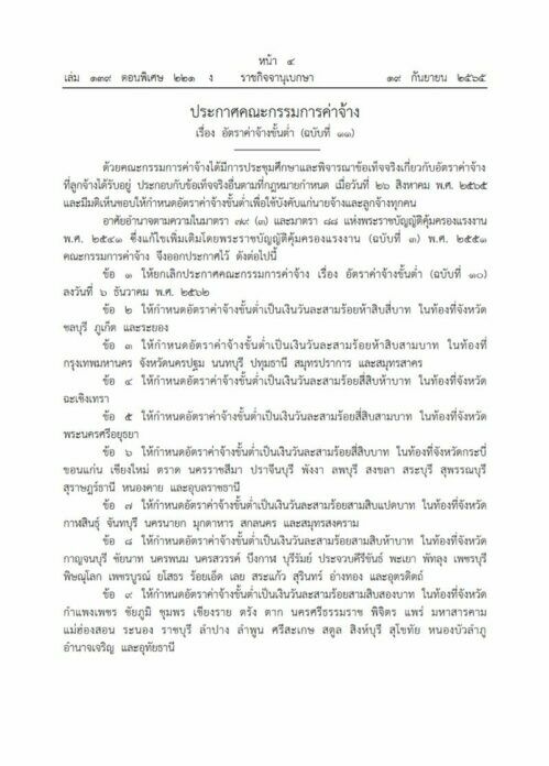 เว็บไซต์ราชกิจจานุเบกษา เผยแพร่ประกาศว่าด้วยการปรับขึ้นค่าแรงขั้นต่ำ จาก คณะกรรมการค่าจ้าง ที่จะมีผลในวันที่ 1 ตุลาคม นี้ โดยประกาศดังกล่าวมีใจความว่า ด้วยคณะกรรมการค่าจ้างได้มีการประชุมศึกษาและพิจารณาข้อเท็จจริงเกี่ยวกับอัตราค่าจ้างที่ลูกจ้างได้รับอยู่ ประกอบกับข้อเท็จจริงอื่นตามที่กฎหมายกำหนด เมื่อวันที่ 26 สิงหาคม พ.ศ.2565 และมีมติเห็นชอบให้กำหนดอัตราค่าจ้างขั้นต่ำเพื่อใช้บังคับแก่นายจ้างและลูกจ้างทุกคน