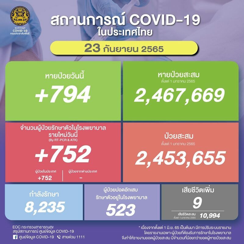 โควิดไทยวันนี้ 23 ก.ย. 65 ติดเชื้อเพิ่ม 752 ราย ดับ 9 ศพ
