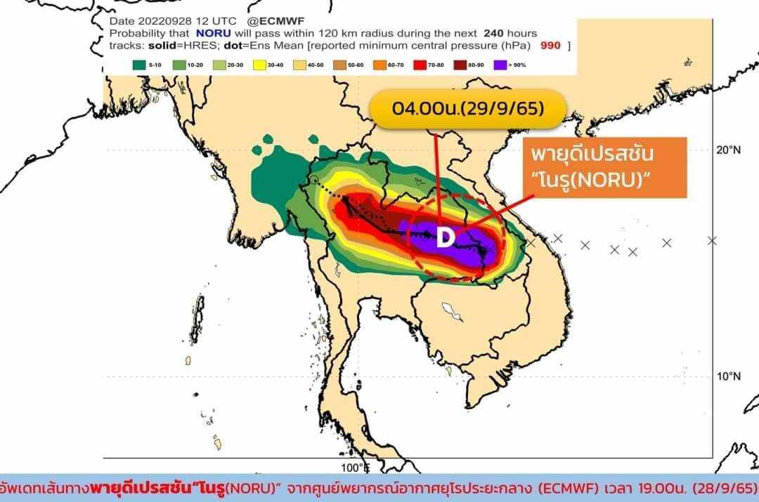 เวลา 04.00 น.วันนี้ (29 ก.ย. 65) : พายุดีเปรสชัน “โนรู” มีศูนย์กลางอยู่บริเวณ อ.คำเขื่อนแก้ว จ.ยโสธร พายุนี้กำลังเคลื่อนตัวทางทิศตะวันตกค่อนทางเหนือเล็กน้อย ด้วยความเร็วประมาณ 15 กม./ชม. คาดว่าจะอ่อนกำลังลงเป็นหย่อมความกดอากาศต่ำกำลังแรงในวันนี้ (29/9/65) ประกอบกับมรสุมตะวันตกเฉียงใต้กำลังแรงพัดปกคลุมทะเลอันดามัน ภาคใต้ และอ่าวไทย