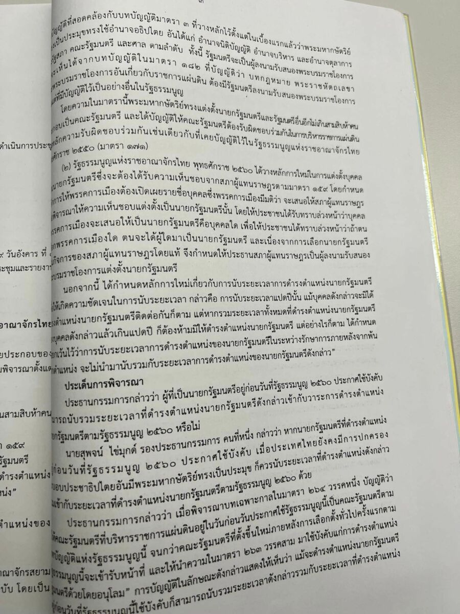 “เมื่อพิจารณาบทเฉพาะกาลในมาตรา 264 วรรคหนึ่ง บัญญัติว่า “ให้คณะรัฐมนตรีที่บริหารราชการแผ่นดินอยู่ในวันก่อนหน้าประกาศใช้รัฐธรรมนูญนี้เป็นคณะรัฐมนตรีตามบทบัญญัติแห่งรัฐธรรมนูญนี้ จนกว่าคณะรัฐมนตรีที่ตั้งขึ้นใหม่ภายหลังการเลือกตั้งทั่วไปครั้งแรกตามรัฐธรรมนูญนี้จะเข้ารับหน้าที่ และให้นำความในมาตรา 263 วรรคสาม มาใช้บังคับแก่การดำรงตำแหน่งด้วยโดยอนุโลม” การบัญญัติในลักษณะดังกล่าวแสดงให้เห็นว่า แม้จะดำรงตำแหน่งนายกรัฐมนตรีอยู่ก่อนวันที่รัฐธรรมนูญนี้ใช้บังคับก็สามารถนับรวมระยะเวลาดังกล่าวรวมกับระยะเวลาที่ดำรงตำแหน่งนายกรัฐมนตรีตามรัฐธรรมนูญ 2560 ได้ ซึ่งเมื่อนับรวมระยะเวลาที่ดำรงตำแหน่งนายกรัฐมนตรีต้องมีระยะเวลาไม่เกิน 8 ปี”