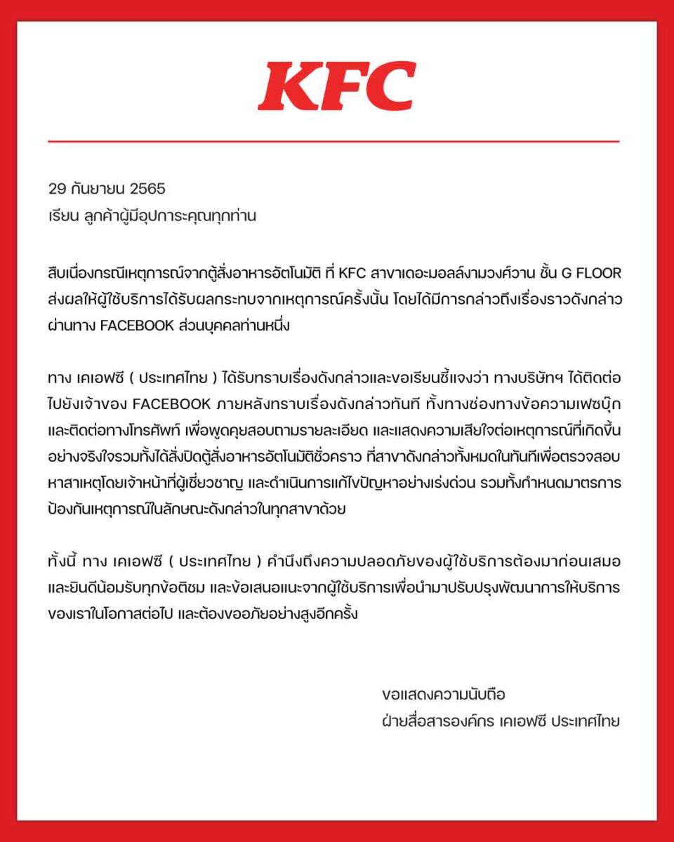 ทั้งนี้ ทาง เคเอฟซี ( ประเทศไทย ) คำนึงถึงความปลอดภัยของผู้ใช้บริการต้องมาก่อนเสมอมและยินดีน้อมรับทุกข้อติชม และข้อเสนอแนะจากผู้ใช้บริการเพื่อนำมาปรับปรุงพัฒนาการให้บริการ ของเราในโอกาสต่อไป และต้องขออภัยอย่างสูงอีกครั้ง”