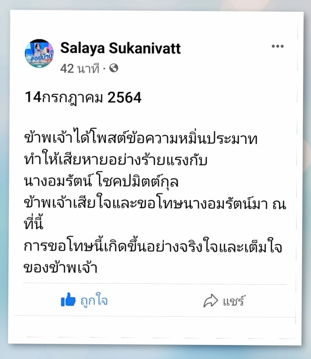 ขณะที่ทางนาง ศัลยา ก็ได้โพสต์ข้อความเฟซบุ๊กแสดงความเสียใจและขอโทษ นางอมรัตน์ พร้อมระบุว่าการขอโทษนี้เกิดขึ้นอย่างจริงใจและเต็มใจ