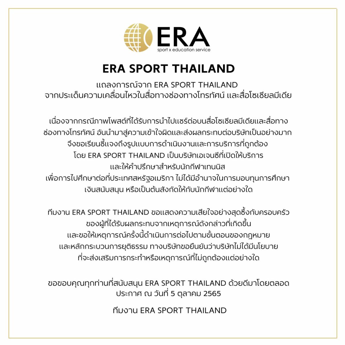 โดย ERA SPORT THAILAND เป็นบริษัทเอเยนซี่ที่เปิดให้บริการ และให้คำปรึกษาสำหรับนักกีฬาเทนนิส เพื่อการไปศึกษาต่อที่สหรัฐอเมริกา ไม่ได้มีอำนาจในการมอบทุนการศึกษา เงินสนับสนุน หรือเป็นต้นสังกัดให้กับนักกีฬาแต่อย่างใด