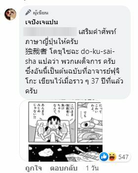 ทางเจปังเจแปนก็ได้ออกมาชี้แจง ระบุว่าทางต้นฉบับใช้คำว่า 独裁者 (Do-ku-sai-sha) แปลว่าเผด็จการจริง พร้อมแปะต้นฉบับด้วยว่าอาจารย์ฟุจิโกะเป็นคนใช้คำนี้จริงๆ ซึ่งมีชาวเน็ตเข้ามาเสริมว่าต้นฉบับของ โดราเอม่อนเดอะมูฟวี่ สงครามอวกาศจิ๋วของโนบิตะ ก็พูดใช้คำว่าเผด็จการเหมือนกัน