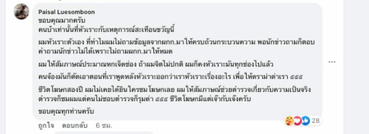 ผมให้สัมภาษณ์ประมาณ 6-7 ช่อง ถ้าผมจิตไม่ปกติ ผมก็คงหัวเราะมันทุกช่องไปแล้ว คนจ้องมันก็ตัดเอาตอนที่เราพูดหลังหัวเราะออก ว่าเราหัวเราะเรื่องอะไร เพื่อให้ดรามาด่าเรา 555 ชีวิตโฆษกสองปี ผมไม่เคยได้ยินใครชมโฆษกเลย ผมให้สัมภาษณ์ช่วยตำรวจเกี่ยวกับความเป็นจริง ตำรวจก็ชมผม แต่คนไม่ชอบตำรวจก็รุมด่า 555 ชีวิตโฆษกมีแต่เจ๊ากับเจ๊งครับ ขอบคุณทุกท่านครับ”
