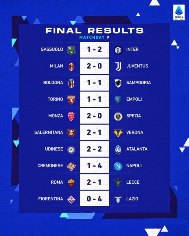 สรุปผลการแข่งขัน กัลโช่ เซเรียอา อิตาลี หลังจบสัปดาห์ที่เก้า