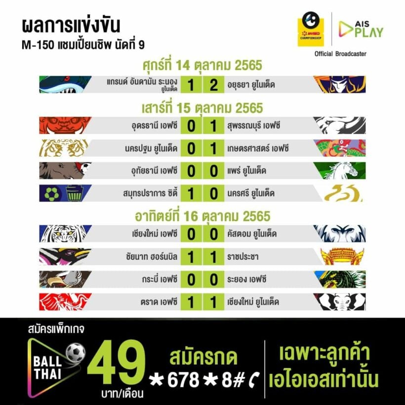 สรุปผลการแข่งขัน ไทยลีก2 M-150 แชมเปี้ยนชิพ หลังจบสัปดาห์ที่9