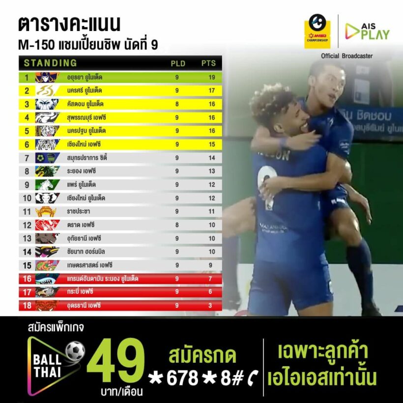 สถานการณ์ ตารางคะแนน ล่าสุดของศึก ไทยลีก2 M-150 แชมเปี้ยนชิพ นั้นเป็นทาง อยุธยา ยูไนเต็ด ที่ขึ้นมานำเป็นจ่าฝูง มี 19 คะแนน ตามมาด้วย นครศรี ยูไนเต็ด ที่มี 17 คะแนน และอันดับที่สามเป็นของ คัสตอม ยูไนเต็ด มี 16 คะแนน