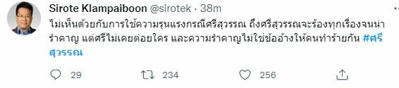 รวมถึง ศิโรตม์ คล้ามไพบูลย์ ผู้สื่อข่าวชื่อดังที่ระบุว่า “ไม่เห็นด้วยกับการใช้ความรุนแรงกรณีศรีสุวรรณ ถึงศรีสุวรรณจะร้องทุกเรื่องจนน่ารำคาญ แต่ศรีไม่เคยต่อยใคร และความรำคาญไม่ใช่ข้ออ้างให้คนทำร้ายกัน”