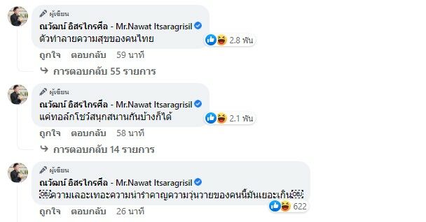 แม้แต่บอสใหญ่เวทีมิสแกรนด์ ณวัฒน์ อิสรไกรศีล ก็ขอร่วมวงมาแสดงความเห็นกับเขาด้วย โดยล่าสุดบอสณวัฒน์ได้โพสต์ข้อความผ่านเฟซบุ๊กส่วนตัว ณวัฒน์ อิสรไกรศีล – Mr.Nawat Itsaragrisil ว่า “ความรุนแรงไม่ดีแต่โดนต่อยบ้างก็ดี รำคาญ”