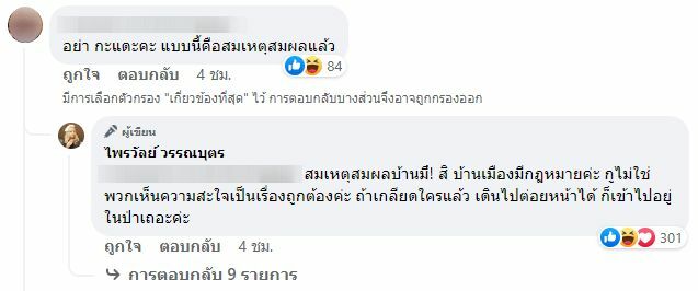 ทำเอา แพรรี่ ไพรวัลย์ ถึงกับเดือดและเขียนโต้กลับว่า “สมเหตุสมผลบ้านมึ..! สิ บ้านเมืองมีกฎหมายค่ะ กูไม่ใช่พวกเห็นความสะใจเป็นเรื่องถูกต้องค่ะ ถ้าเกลียดใครแล้ว เดินไปต่อยหน้าได้ ก็เข้าไปอยู่ในป่าเถอะค่ะ”