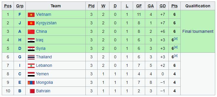 ล่าสุด จากผลการแข่งขันในกลุ่ม เอช ที่ออสเตรเลีย เอาชนะ อิรัก 1-0 ทำให้ทีมชาติไทย ที่มี 6 คะแนนและมีประตูได้เสียอยู่ที่ +3 เท่ากับอิรัก และซีเรีย ทำให้ทั้งสามทีมต้องมาวัดกันในเรื่องคะแนนแฟร์เพลย์ หรือก็คือการวัดจำนวนใบเหลือง-ใบแดง