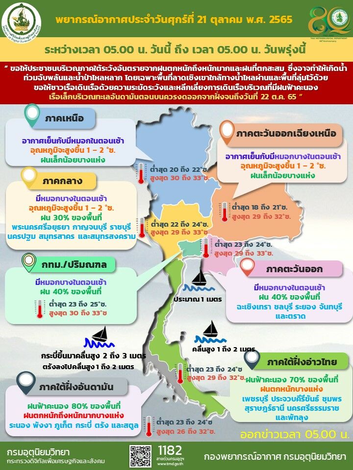 สภาพอากาศวันนี้ 22 ต.ค. 65 ฝนตกทุกภูมิภาค ใต้หนักสุดร้อยละ 80
