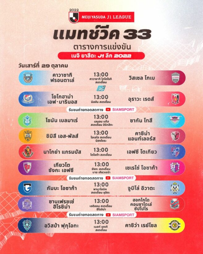 - 13:00 น. คาวาซากิ ฟรอนตาเล่ พบ วิสเซล โคเบะ *ถ่ายทอดทาง Siamsport*
