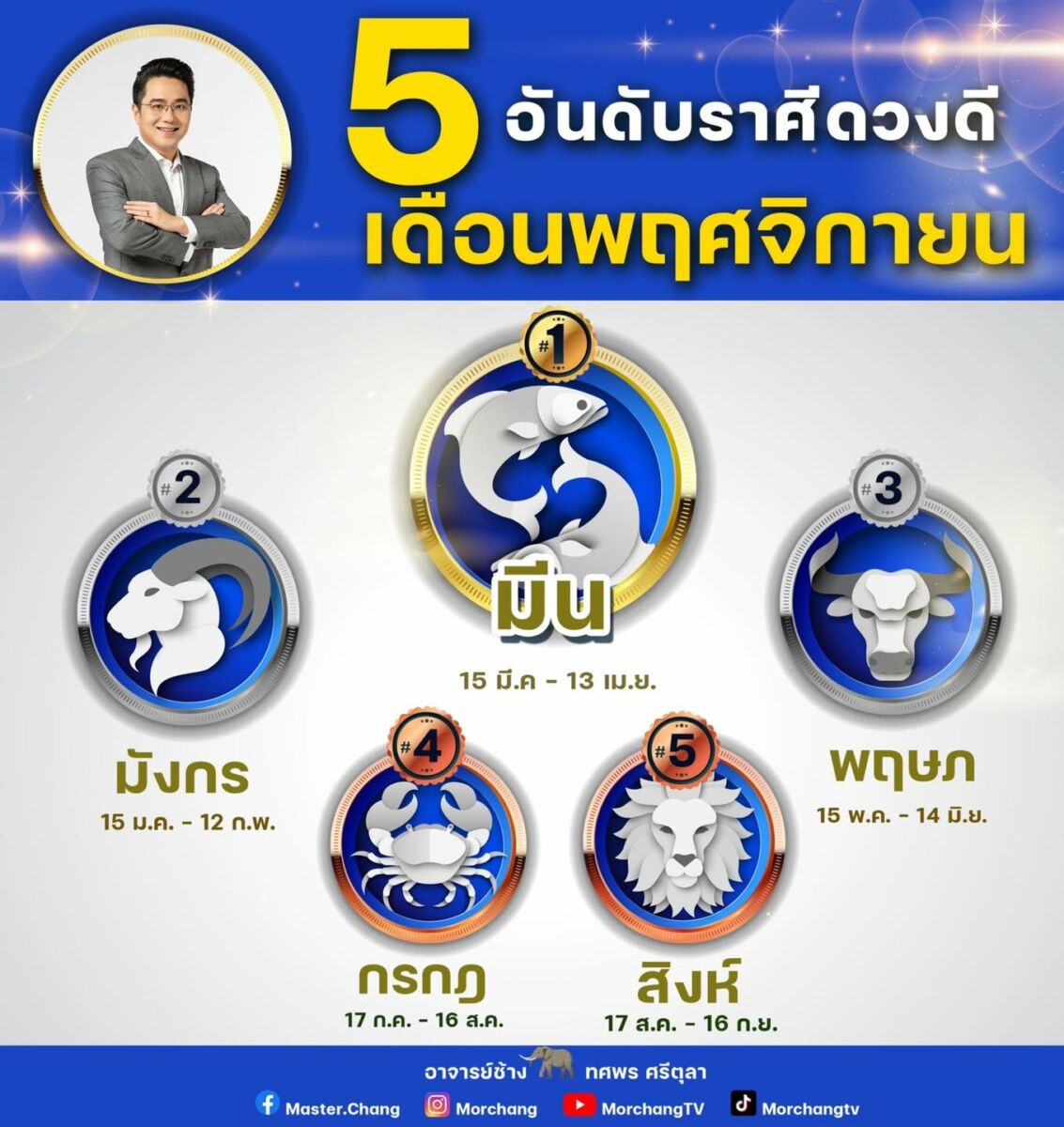 เช็กเลย 5 อันดับราศีดวงดีเดือนพฤศจิกายน 65 กับ หมอช้าง ทศพร มาดูกันเลยว่าราศีไหนจะปัง จะเลิศในเดือนนี้