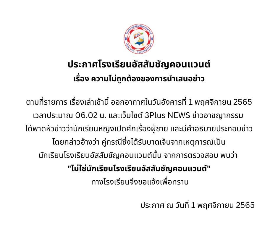 ทาง โรงเรียนอัสสัมชัญคอนแวนต์ ยืนยันว่าไม่เป็นความจริง โดยทางโรงเรียนระบุว่า ตามที่มีการออกอากาศในวันอังคารที่ 1 พฤศจิกายน 2565 เวลาประมาณ 6.02 ได้พาดหัวข่าวว่านักเรียนหญิงเปิดศึกเรื่องผู้ชาย และมีคำอธิบายกล่าวอ้างว่า คู่กรณีซึ่งได้รับบาดเจ็บเป็นนักเรียนอัสสัมชัญคอนเวนต์นั้น