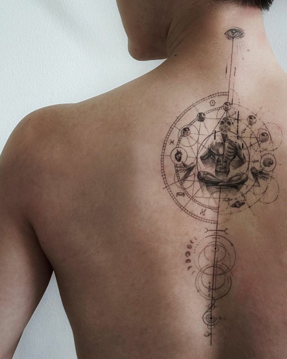 “My 1st “Big” tattoo!!! อันแรกก็จัดเต็มเลยยยย จากแค่คิดว่าจะทำแค่ตา Third Eye ที่มีความหมายคอยปกป้องเราจากสิ่งร้ายจากข้างหลัง ลามลงไปถึง Alien และความชอบต่างๆ ที่ฝังอยู่ในลาย มีความหมายทุกจุด!!”