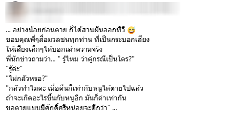 พี่นักข่าวถามว่า… ” รู้ไหม ว่าคู่กรณีเป็นใคร?” “รู้ค่ะ” “ไม่กลัวหรอ?” “กลัวทำไมคะ เมื่อคืนก็เท่ากับหนูได้ตายไปแล้ว