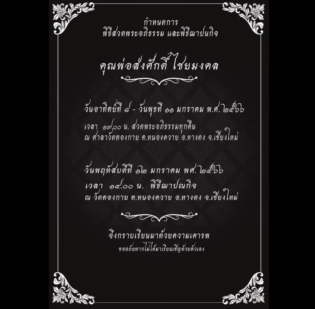 วันพฤหัสบดีที่ 12 ม.ค. พ.ศ. 2566 เวลา 14.00 น. พิธีฌาปนกิจ ณ วัดตองกาย ต.หนองควาย อ.หางดง จ.เชียงใหม่ จึงกราบเรียนมาด้วยความเคารพ ขออภัยหากไม่ได้มาเรียนเชิญด้วยตัวเอง