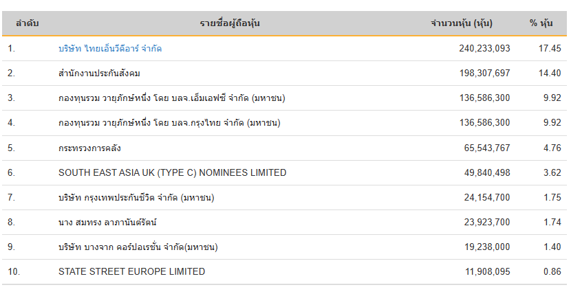 1. บริษัท ไทยเอ็นวีดีอาร์ จำกัด 240,233,093 คิดเป็นร้อยละ 17.45