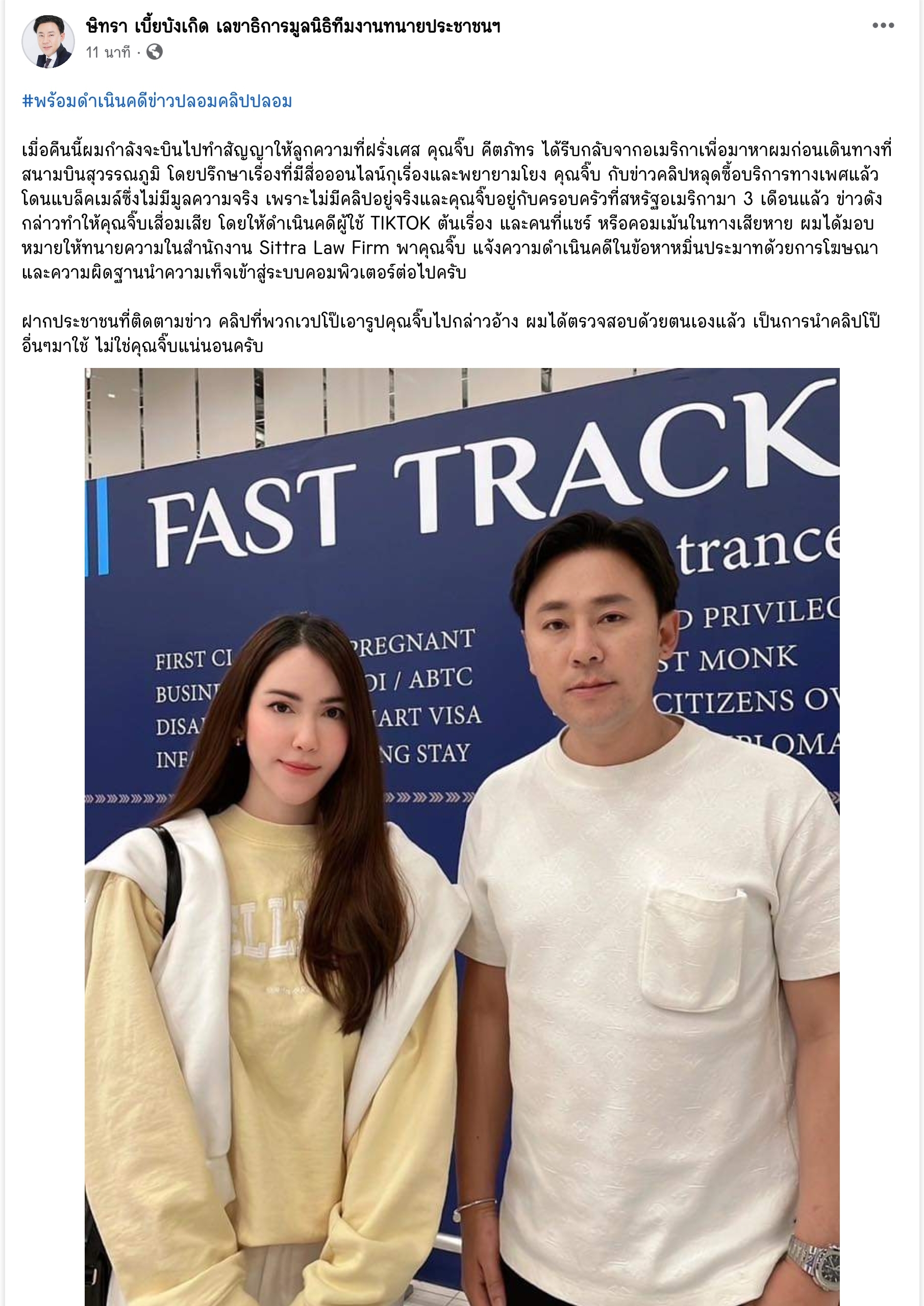 และคุณจิ๊บอยู่กับครอบครัวที่สหรัฐอเมริกามา 3 เดือนแล้ว ข่าวดังกล่าวทำให้คุณจิ๊บเสื่อมเสีย โดยให้ดำเนินคดีผู้ใช้ TIKTOK ต้นเรื่อง และคนที่แชร์ หรือคอมเม้นในทางเสียหาย ผมได้มอบหมายให้ทนายความในสำนักงาน Sittra Law Firm พาคุณจิ๊บ แจ้งความดำเนินคดีในข้อหาหมิ่นประมาทด้วยการโฆษณา และความผิดฐานนำความเท็จเข้าสู่ระบบคอมพิวเตอร์ต่อไปครับ