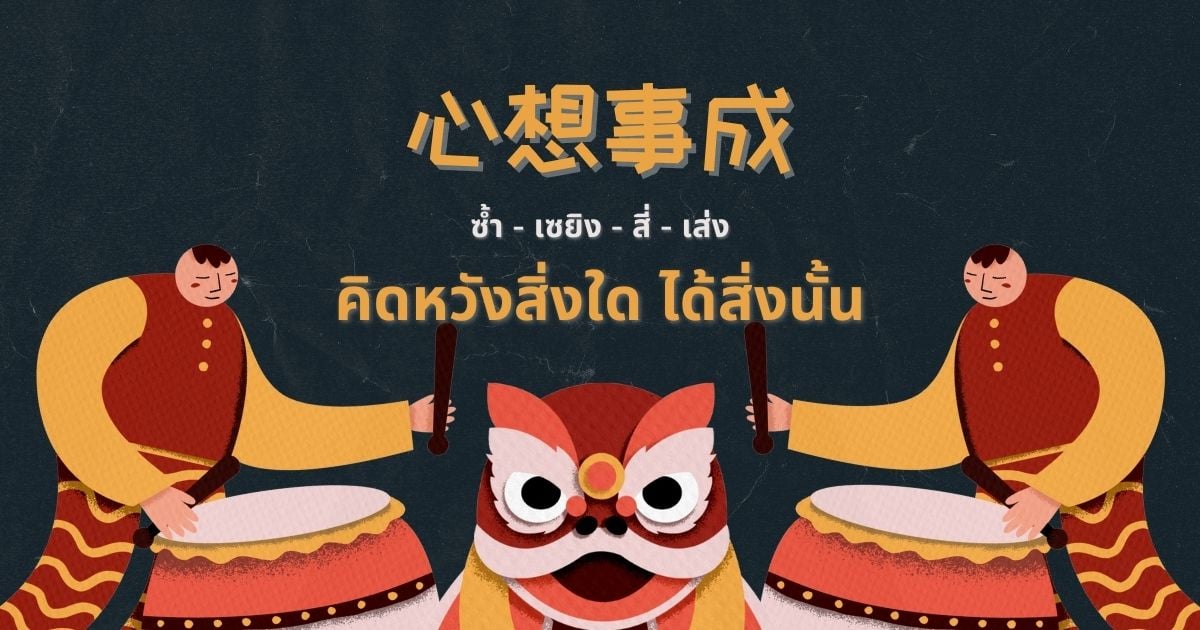 - 心想事成 (ซ้ำ – เซยิง – สี่ – เส่ง) แปลว่า คิดหวังสิ่งใด ได้สิ่งนั้น