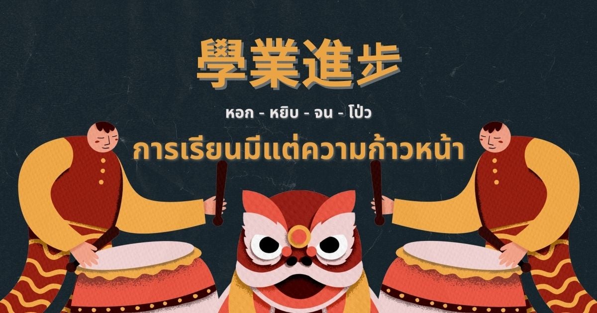 - 學業進步 (หอก – หยิบ – จน – โป่ว) แปลว่า การเรียนมีแต่ความก้าวหน้า