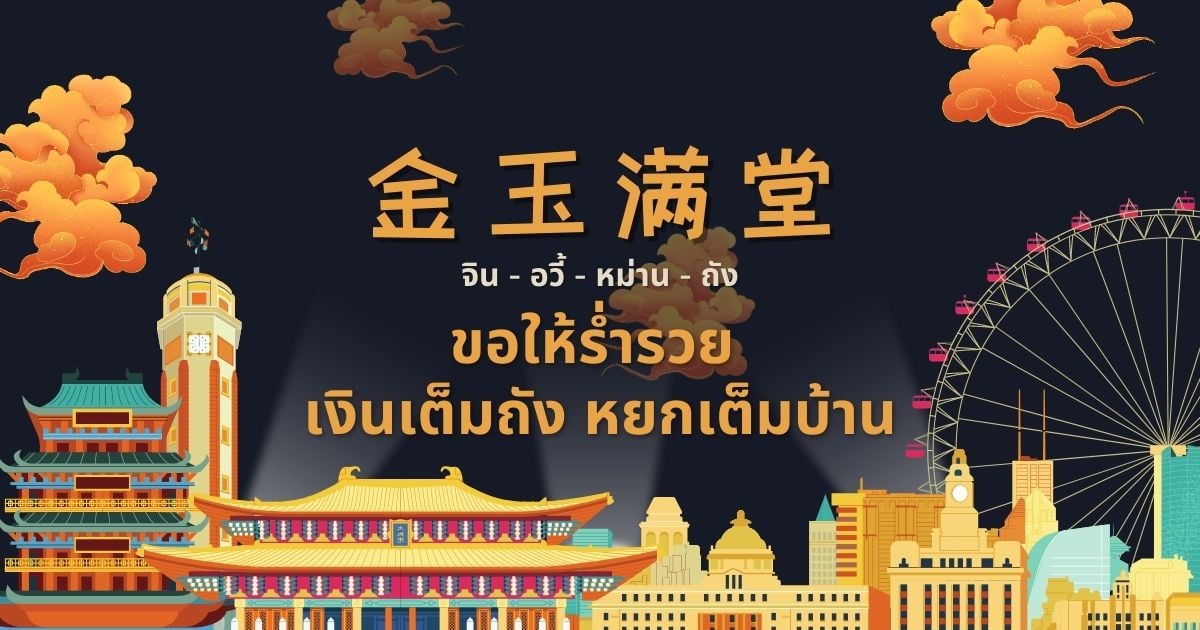 - 金 玉 满 堂 (จิน – อวี้ – หม่าน – ถัง) แปลว่า ขอให้ร่ำรวย เงินเต็มถัง หยกเต็มบ้าน