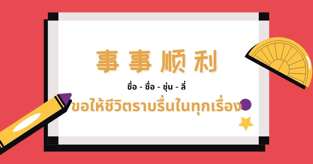 - 事 事 顺 利 (ชื่อ – ชื่อ – ชุ่น – ลี่) แปลว่า ขอให้ชีวิตราบรื่นในทุกเรื่อง