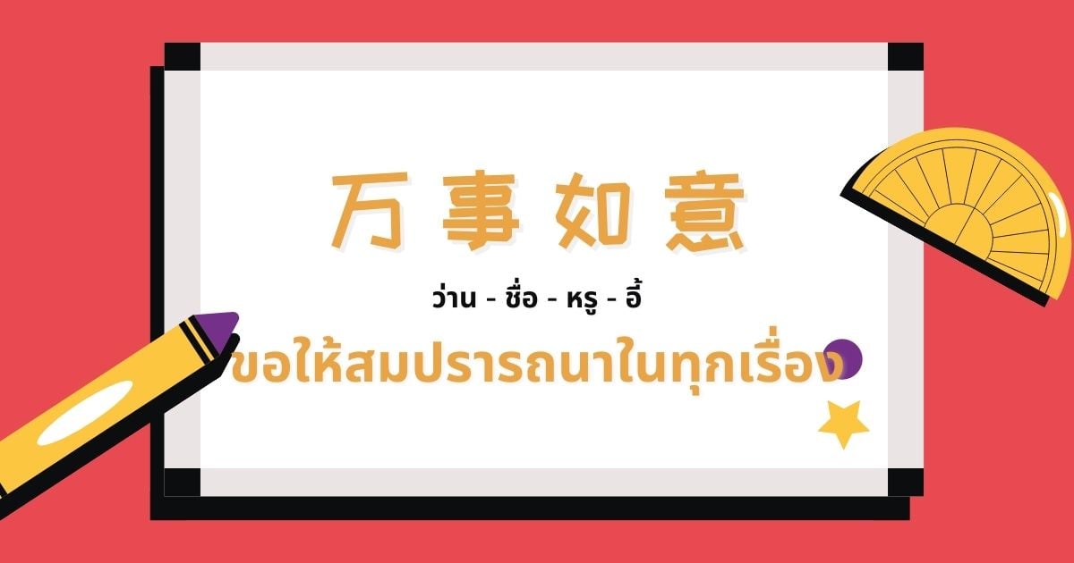 - 万 事 如 意 (ว่าน – ชื่อ – หรู – อี้) แปลว่า ขอให้สมปรารถนาในทุกเรื่อง